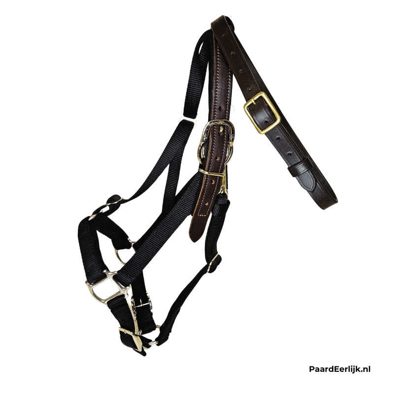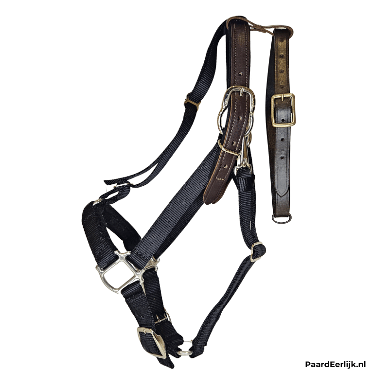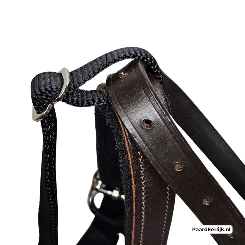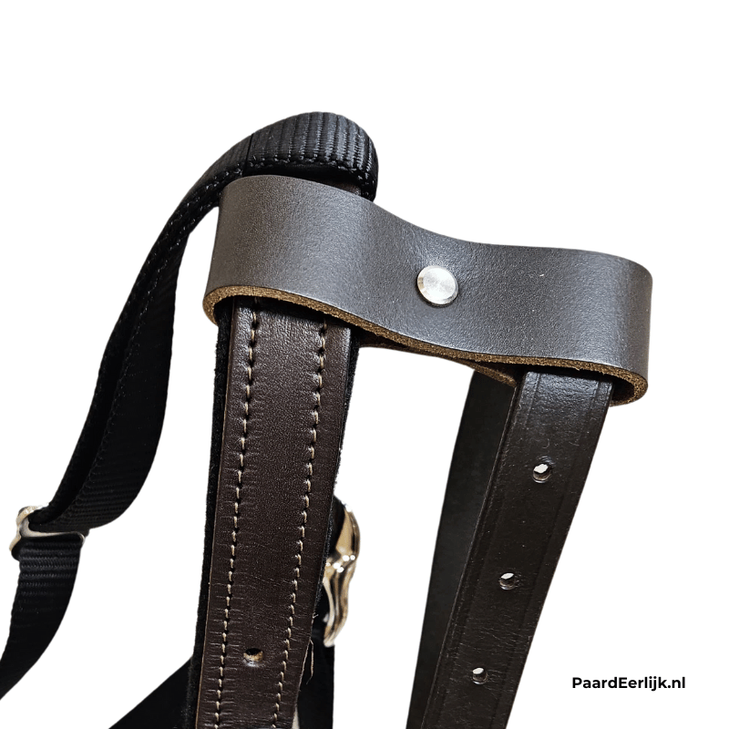 Plaats de lederen riem om het smalste deel van de hals en verbind de riem aan het kopstuk van het halster. Bij GG Equine Deluxe halsters of bij halsters waarbij je een extra neusriem gebruikt kun je de riem door het lusje van de neusriem halen zoals op foto 2 en 3. Heb je een ander halster dan kun je een leren tussenstukje gebruiken zoals op foto 4 en 5. Dit tussenstukje is separaat verkrijgbaar.