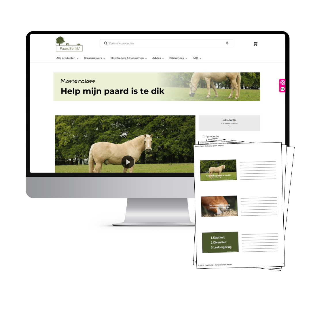 Wil jij een gezond en gelukkig paard dat niet kampt met overgewicht? In deze exclusieve masterclass neem ik je mee in de werking van het paardenlichaam en ontdek je de oorzaken van overgewicht bij paarden. Onbeperkt ruwvoer is een van de grootste veroorzakers van overgewicht bij paarden maar lang niet de enige. Hoe zorg je ervoor dat jouw paard een gezond gewicht behoudt en waarbij je toch zijn natuurlijke behoefte om veel te eten kunt vervullen? Het antwoord op o.a. deze vraag geef ik je in deze masterclass.
