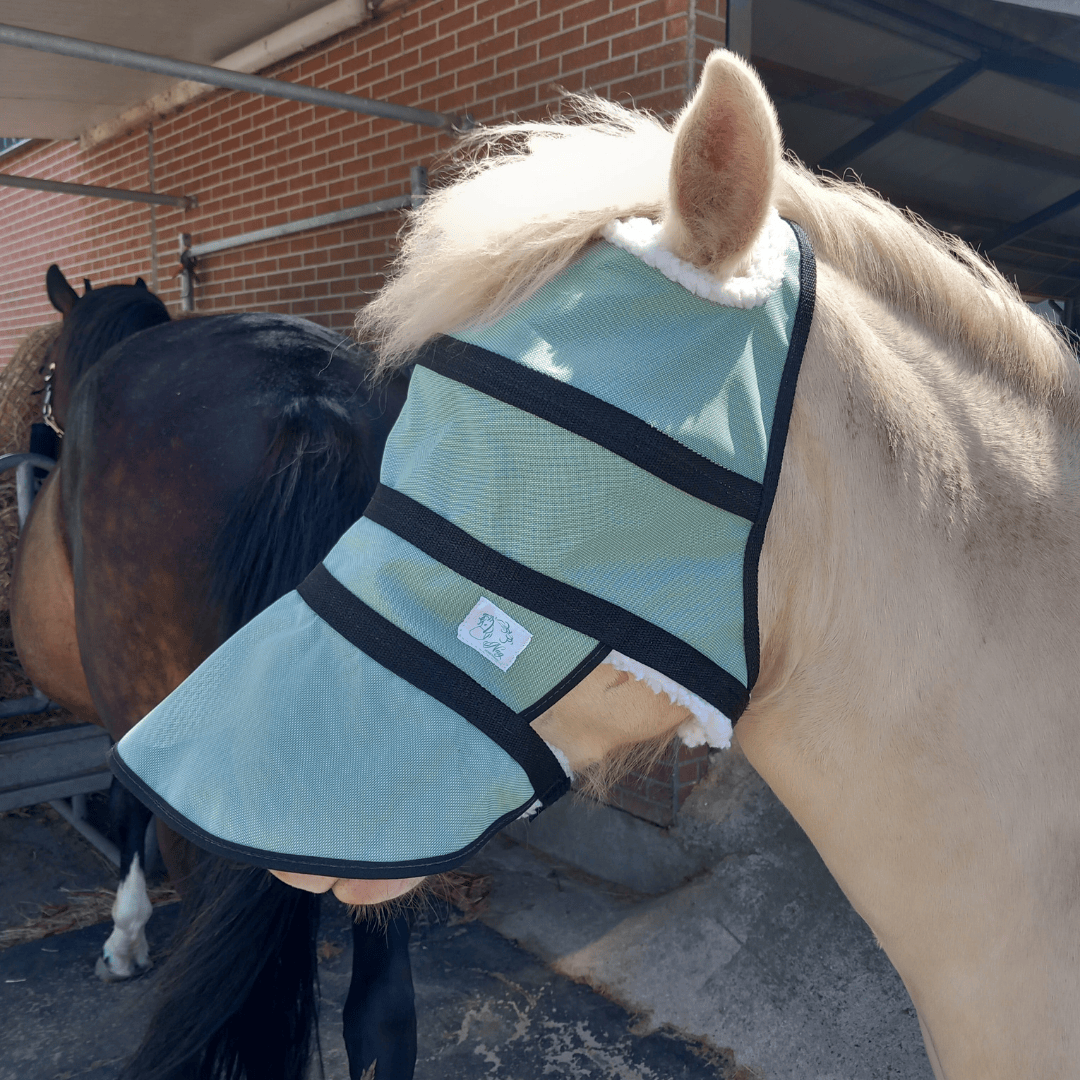 The material provides 90% UV protection and is therefore essential for horses suffering from severe sunburn, blistering and skin cancer. An effective means of preventing UV damage and is therefore very suitable for horses with uveitis, moon blindness, cataracts or other eye conditions. In addition to UV radiation from sunlight, this mask also keeps flies away from your horse's eyes.