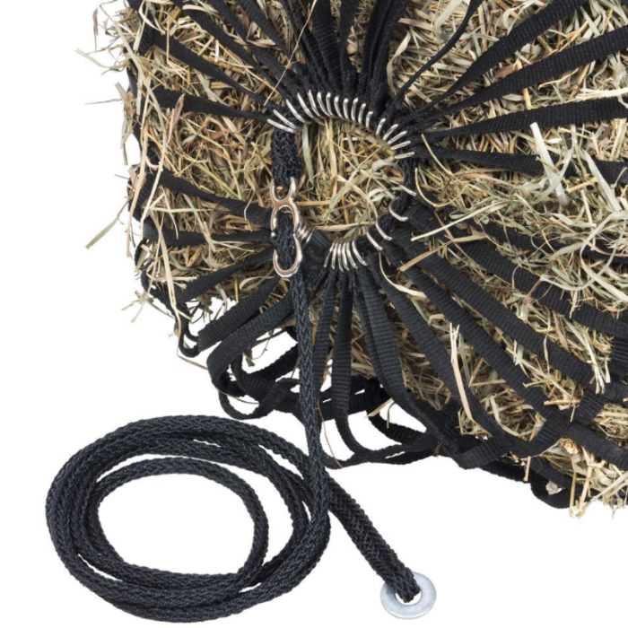 Deze sterke slowfeeder van Tough1® gaat eenvoudig om rechthoekige hooibaaltjes tot 20kg, is gemaakt van oersterk 1,3cm breed nylon band en heeft een maaswijdte van 5x5cm. De slowfeeder is voorzien van een verstelbaar sluitkoord welke na vastzetten in de slowfeeder kan worden geplaatst. Met dit net geef je met gemak een grotere hoeveelheid hooi waarmee je je paarden voor een langere tijd van hooi kunt voorzien.